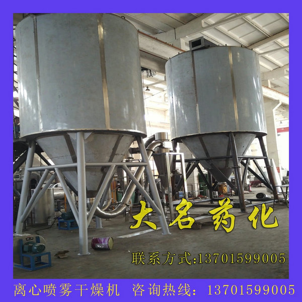 空氣經過濾和加熱,進入干燥器頂部空氣分配器,熱空氣呈螺旋狀均勻地進入干燥室。料液經塔體頂部的高速離心霧化器,(旋轉)噴霧成極細微的霧狀液珠,與熱空氣并流接觸在極短的時間內可干燥為成品。成品連續(xù)地由干燥塔底部和旋風分離器中輸出,廢氣由風機排空。