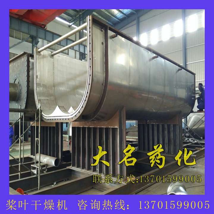 空心軸上密集排列著楔型中空漿葉,熱介質(zhì)經(jīng)空心軸流經(jīng)漿葉。單位有效容積內(nèi)傳熱面積很大,熱介質(zhì)溫度從-40℃到320℃,可以是水蒸汽,也可以是液體型:如熱水、導(dǎo)熱油等。間接傳導(dǎo)加熱,沒有攜帶空氣帶走熱量,熱量均用來加熱物料。熱量損失僅為通過器體保溫層向環(huán)境的散熱。楔型漿葉傳熱面具有自清潔功能。物料顆粒與楔型面的相對運動產(chǎn)生洗刷作用,能夠洗刷掉楔型面上附著物料,使運轉(zhuǎn)中一直保持著清潔的傳熱面。漿葉干燥機的殼體為Ω型,殼體內(nèi)一般安排二到四根空心攪拌軸。殼體有密封端蓋與上蓋,防止物料粉塵外泄而充分發(fā)揮作用。