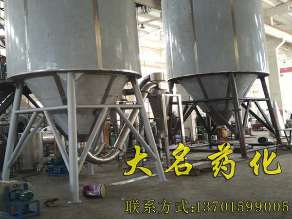 該生產(chǎn)線由供料系統(tǒng)、介質(zhì)循環(huán)系統(tǒng)、空氣加熱凈化系統(tǒng)、干燥塔系統(tǒng)、收料系統(tǒng)、控制系統(tǒng)等多個(gè)系統(tǒng)整合而成。主塔系統(tǒng)集中了目前噴霧干燥工程的所有尖端技術(shù),噴干機(jī)組的收料系統(tǒng)由一級(jí)旋風(fēng)分離器+布袋除塵器組合形成。一級(jí)旋風(fēng)采用高氣量高效率旋風(fēng)進(jìn)行收集,其收粉率能達(dá)到96%左右,而布袋除塵器是針對(duì)蛋白粉類除塵專門設(shè)計(jì)的優(yōu)化設(shè)備,能使物料與風(fēng)進(jìn)行完全分離并沉降,布袋為拒水防油防靜電布袋,過(guò)濾目數(shù)可達(dá)500目以上。